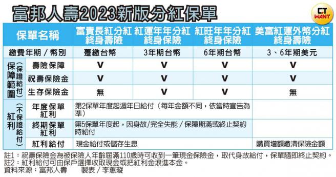 以富邦人寿今年最新推出的四张终身寿险分红保单来看,有台币与美元计价两种,分为趸缴型与3年期、6年期,「保证给付」皆有寿险保障的身故保险金或丧葬补助费、失能保险金以及保户届满110岁仍活着的「祝寿保险金」。