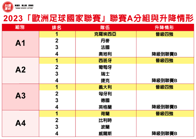 2023欧国联的四强赛将由A1组第1的克罗埃西亚对上A4组第1的荷兰(6/15)以及A2组第1的西班牙对上A3组第1的义大利(6/16),胜方将晋级6/19的冠军赛,败方则进行季军赛,最后的这4场赛事可以说是精彩万分,大家可以一起来买张运彩预测获胜的队伍验证一下自己的眼光。