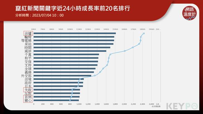 根据《KEYPO大数据关键引擎》舆情分析系统(日期:2023/07/04)统计,近24小时窜红新闻关键字前20名排行中, 有关「全球首例移植猪心手术」的关键字占有4名,其中「出炉」位居第一名,「失败、首例、猪心」则集中在15名以后。究竟是什么新闻让大家如此关注呢?