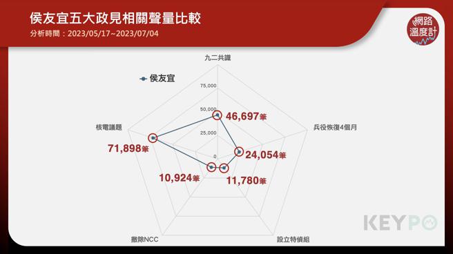 根据《KEYPO大数据关键引擎》舆情分析系统(日期:2023/05/17~2023/07/04)统计调查,自从国民党5月17日宣布提名侯友宜为总统参选人以后,侯友宜多次谈论「核电议题」,因此侯友宜抛出五大政见中,网友最常讨论的是核电议题,近1.5个月累积共7万1,898 笔讨论。侯友宜5月29日曾表示,台湾最重要的就是不能缺电,自己如当选总统,会给大家做一个清楚报告,「我一定会把核安做好,核废料妥善处理,核能就是我的选项」。侯友宜7月3日表示,核一、核二安检测试无虞后,依法延役20年;核三机组明后年到期,必须要准备延役。侯友宜强调,核四要经过专家检验跟评估,及国际标准程序检验后,确保万无一失,就可以重启核四。