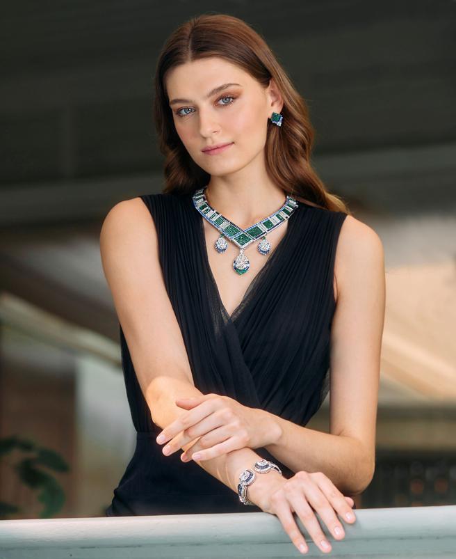 以1928年骨董珠宝为灵感打造的Golden Age钻石项炼,同样以白K金与黄K金的「双金」镶嵌不同切割形状的祖母绿与钻石,以七个几何图案连结成项炼,充满装饰艺术风格,谱出和谐圆融的宝石协奏曲。