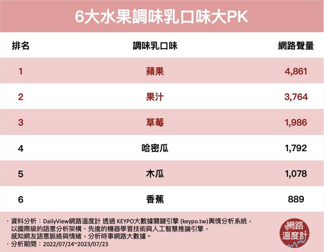 想知道市面上还有哪些让人欲罢不能的调味乳吗?今天《DailyView网路温度计》透过《KEYPO大数据关键引擎》舆情分析系统,带你一起来看水果尬调味乳的6大霸主有哪几位吧!