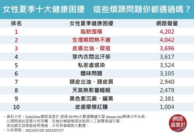 你知道女生在夏天容易遇到什么健康方面的问题吗?《DailyView网路温度计》透过《KEYPO大数据关键引擎》舆情分析系统,调查出了女性在夏季最容易遇到的健康困扰TOP 10,身为男性的你对这些了解吗?身为女性的你又经歷过哪些呢?一起来看看吧!