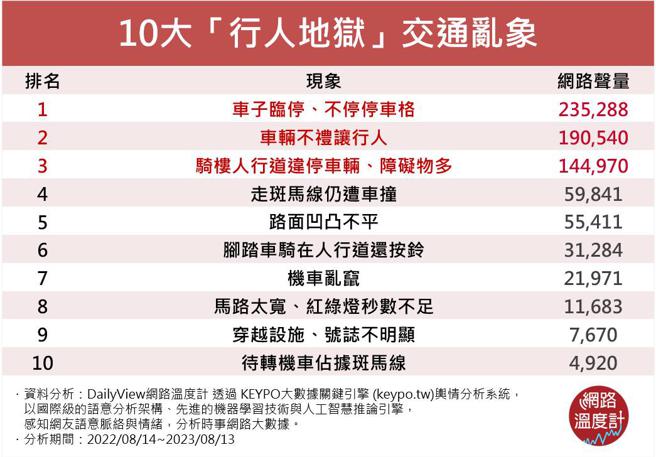 《DailyView网路温度计》透过《KEYPO大数据关键引擎》舆情分析系统调查网友最有感的「10大交通乱象」,如何有效降低行人意外死伤,同时又避免行车交通混乱,是政府及民眾需要共同努力的方向!