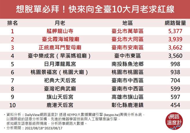 《DailyView网路温度计》曾经于2016年透过《KEYPO大数据关键引擎》舆情分析系统,调查出「全臺10大月老」,和当年相比,近一年来的月老网路声量排名也出现了些许变化,除了大名鼎鼎的龙山寺、霞海城隍庙外,还有哪些厉害的月老在近年受到高度讨论呢?快把这份清单收藏起来,为自己安排一趟月老巡礼吧!