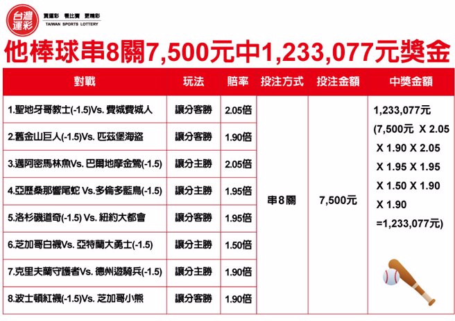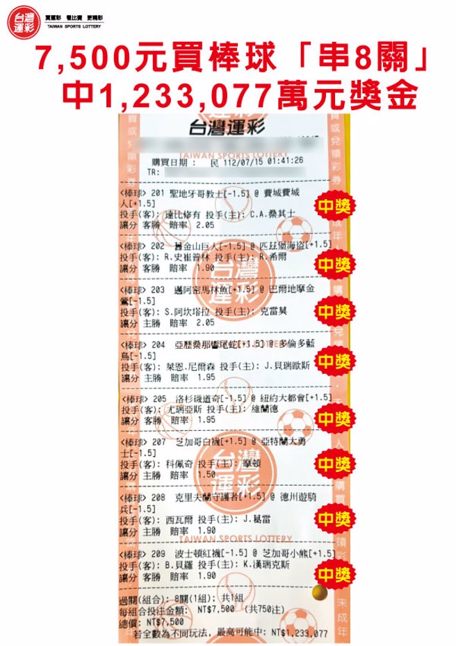 7/15有位高雄投注站的购券者,他买运彩时挑了8场棒球赛事,并且买串8关让赔率连续相乘来提高可能中奖的金额,分别是1.「赔率2.05倍的圣地牙哥教士(-1.5)Vs. 费城费城人 让分客胜」、2.「赔率1.90倍的旧金山巨人(-1.5)Vs. 匹兹堡海盗 让分客胜」、3.「赔率2.05倍的迈阿密马林鱼Vs. 巴尔地摩金莺(-1.5) 让分主胜」、4.「赔率1.95倍的亚歷桑那响尾蛇 Vs.多伦多蓝鸟(-1.5) 让分主胜」、5.「赔率1.95倍的洛杉矶道奇(-1.5) Vs. 纽约大都会 让分客胜」、6.「赔率1.50倍的芝加哥白袜Vs. 亚特兰大勇士(-1.5) 让分主胜」、7.「赔率1.90倍的克里夫兰守护者Vs. 德州游骑兵(-1.5) 让分主胜」以及8.「赔率1.90倍的波士顿红袜(-1.5)Vs. 芝加哥小熊 让分客胜」,比赛结果全数命中,8场赛事赔率连续相乘的结果高达164.41倍,让他投注7,500元开心中奖1,233,077元。