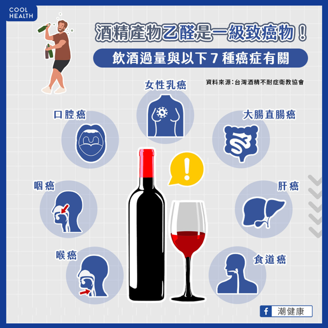 提及酒精对身体的危害,事实上世卫组织(WHO)早在2007年就已将「酒类饮料」及酒精所产生的「乙醛」,认定为一级致癌物,乙醛的暴露及累积在体内会大幅提升罹癌风险。而根据2023年WHO的统计显示,饮酒会导致至少7种类型的癌症,分别是口腔癌、咽癌、喉癌、食道癌、肝癌、大肠直肠癌与女性乳癌。