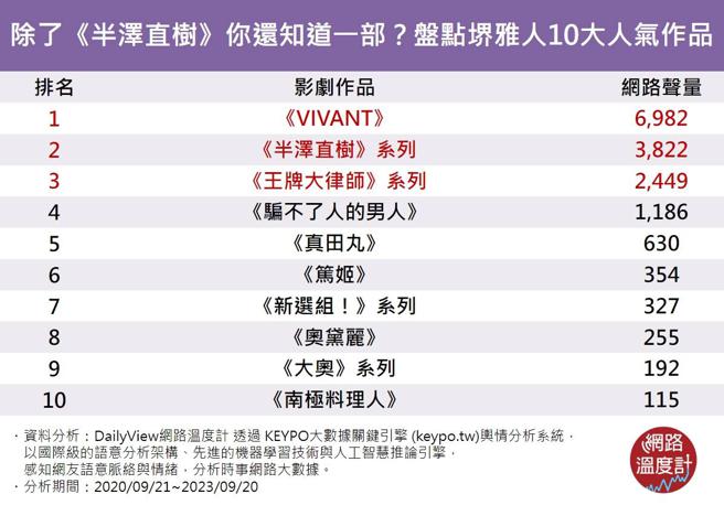 除了最新的《VIVANT》外,实力派演员堺雅人的许多戏剧、电影作品都让人印象深刻,像是在日剧迷心目中十分经典的《王牌大律师》、《半泽直树》,以及大河剧《笃姬》、《新选组!》等等。在堺雅人的眾多作品中,你最喜欢哪一部呢?《DailyView网路温度计》透过《KEYPO大数据关键引擎》舆情分析系统》,调查出了网路讨论度最高的堺雅人10大人气作品,一起来看看吧!