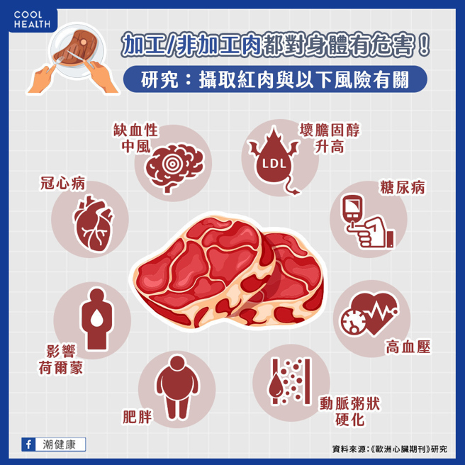 对此,《欧洲心臟期刊》一项统合分析指出 ,无论是加工或是未加工的红肉,都与较高的心血管疾病、第2型糖尿病风险有关,而且男女之间没有明显差异。该项统合分析所收集的研究数据涵盖440万心血管疾病患者、176万名糖尿病患者,经过系统性回顾后发现,无论是未加工或是加工后的红肉,都与较高风险的冠心病(CHD)及第2型糖尿病有关。