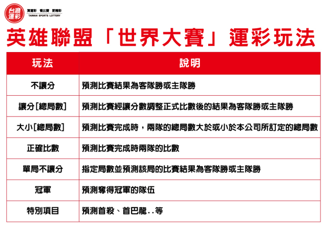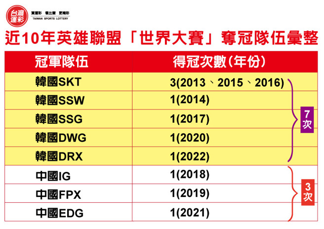 英雄联盟世界大赛近10年来的冠军以韩国的7次最多,其次是中国的3次,上一届2022的冠军是由韩国的DRX夺得,本届22支队伍谁能夺冠,大家可以买张运彩「冠军」猜一猜,其他还有不让分、让分、大小、正确比数、单局不让分及特别项目等多种玩法,希望喜欢电竞的朋友们从「入围赛」(10/10)就可以开始一起加入运彩投注的行列,也可以买张运彩预测冠军会是谁。