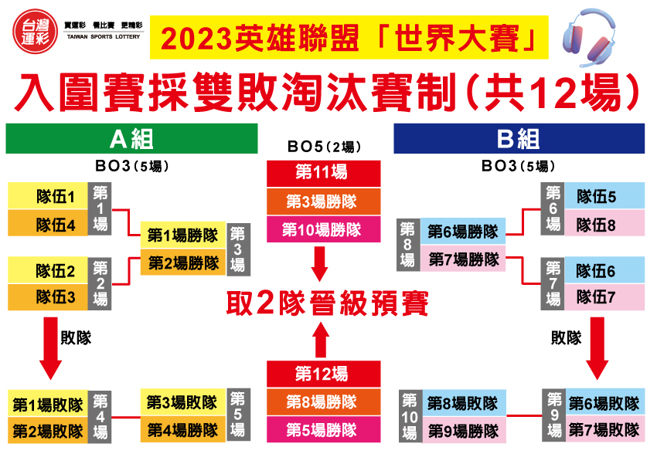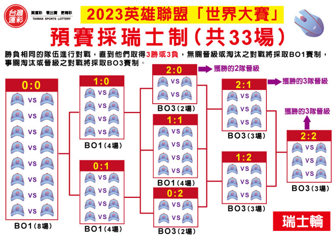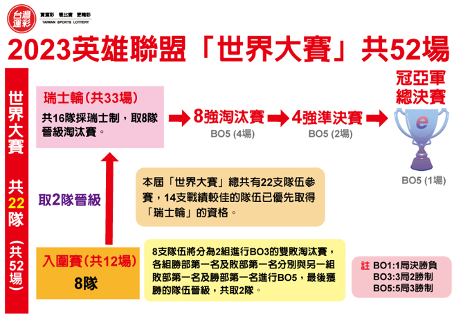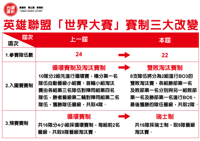 整个「世界大赛」的赛制改变后,总场次从原本的89场缩减为52场,其中「入围赛」分为A、B 2组,BO3(注1) 10场、BO5(注2) 2场,合计12场;「瑞士轮」BO1 20场、BO3 13场,共33场;加上8强「淘汰赛」BO5 4场、4强「准决赛」BO5 2场以及冠亚军「总决赛」BO5 1场,合计52场比赛。