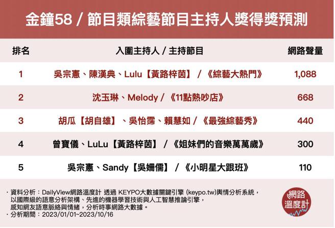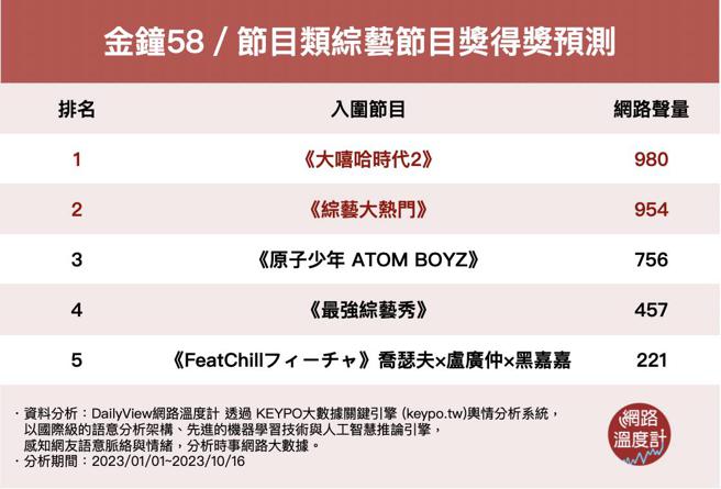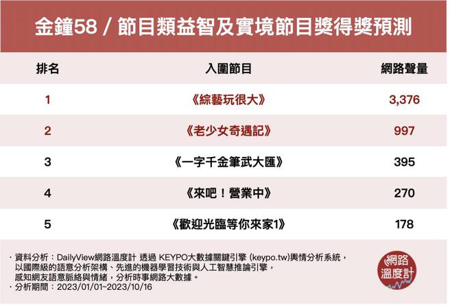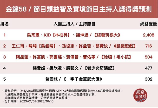 《KEYPO大数据关键引擎》舆情分析系统拥有巨量资料,以人工智慧作语意分析之工具资料搜集范围:每月处理1000亿以上中文资料的网路社群大数据资料库,其内容涵盖Facebook、YouTube、新闻媒体、讨论区、部落格等网站,针对讨论『第58届金钟奖节目类』相关文本进行分析,并根据网友就该议题之讨论,作为本分析依据。本文所调查之结果,非参考投票、民调、网路问卷等资料,名次仅代表网路讨论声量大小,不代表网友正负评价。