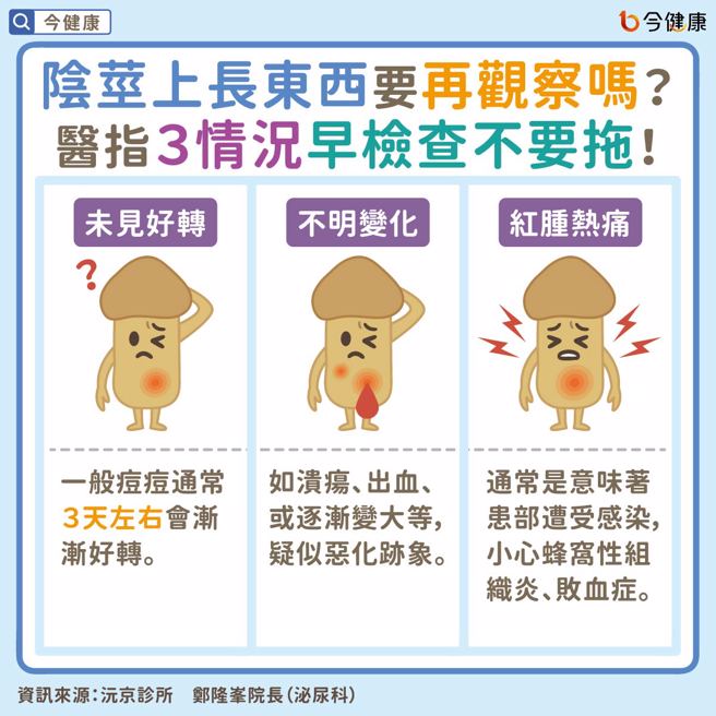 因此郑隆峯院长建议,若民眾使用痘痘药、外伤药等方式自行处理、观察,发现3天后未见好转,或甚至肿块出现溃疡、不明出血、逐渐变大等,就先前往医疗院所检查为佳,因为一般的毛囊炎等轻微皮肤疾病通常在3天就会好转,更不用说出现疑似患部恶化的徵兆。而若是出现红肿热痛,就得尽速就医,这通常是代表着已经出现感染,若状况迟未妥善治疗,可能进展成蜂窝性组织炎或败血症,影响生命安全。