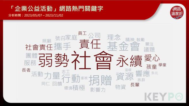 《DailyView网路温度计》透过《KEYPO大数据关键引擎》舆情分析系统观察,近半年内(2023/05/07~2023/11/02)「企业公益活动」的热门关键字,网友们高度关注讨论社会、永续、责任、弱势、爱心等。