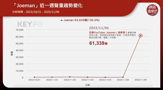 透过《KEYPO大数据关键引擎》舆情分析系统可以看到,截至今(7)日上午11时为止,Joeman近一周共累积63,645笔网路声量。11月6日爆出持有大麻消息后讨论度更是直线上升,声量一夕暴涨61,339笔,不但吸引全网关注,歌手谢和弦也在脸书转贴相关新闻,喊话「挺joeman跟蕾菈,以后都是我的自己人,烂政府大麻合法化哈们」。