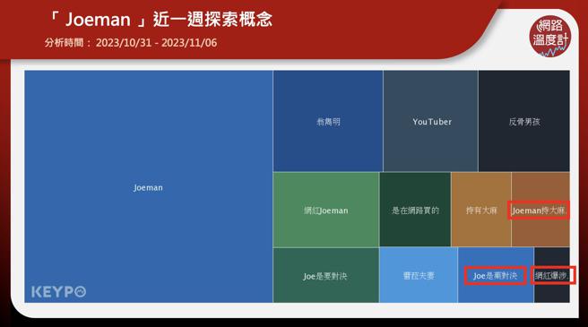 另外,观察Joeman近一周的网路探索概念也可以看到,「网红爆涉毒」、「持有大麻」以及「Joe是药对决」等字词都成为热搜。