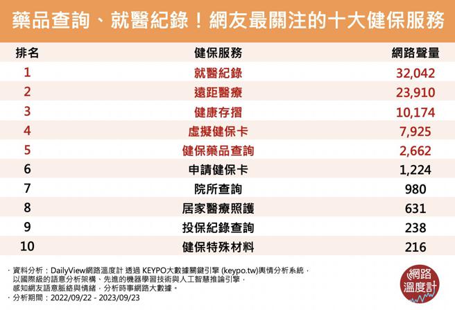 你知道吗?许多民眾关注的议题,像是健保药品查询、申请健保卡程序等,都能透过网路或APP快速得到解答喔!这次《DailyView网路温度计》透过《KEYPO大数据关键引擎》舆情分析系统,调查出网友们最关注的十大健保服务,快一起来看看,有没有什么是你不知道的便利服务吧!