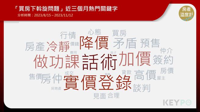 买房下斡旋时还会探讨哪些问题?《DailyView网路温度计》透过《KEYPO大数据关键引擎》舆情分析系统观察,近三个月内「买房下斡旋问题」的热门关键字,许多网友在讨论话术、实价登录、加价、降价、做功课等。