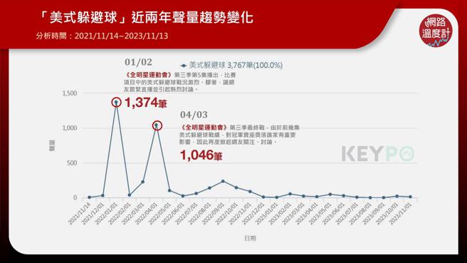 透过《KEYPO大数据关键引擎》舆情分析系统可以看见,「美式躲避球」近两年的网路声量中有两个高峰,最高点为《全明星运动会3》第五集播出时创下1,374笔,这集的主要比赛项目为美式躲避球,战况紧张,带动网友们的热烈讨论。第二个高点则为《全明星运动会3》最终集,前几集中美式躲避球的战绩对总成绩至关重要,影响冠军宝座奖落谁家,因此再度掀起热议,累积1,046笔网路声量。