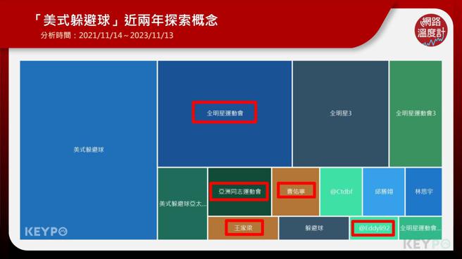 另一方面,探索概念中出现了多个《全明星运动会》的出演艺人,像是曹佑寧、王家梁、邱胜翊等,都是在美式躲避球比赛中大放异彩的MVP,可见《全明星运动会》成功引起大眾对这项运动的高度兴趣。致力推广美式躲避球的《中华⺠国美式躲避球协会》理事长IG帐号「Eddyli92」也被想多了解该运动的网友热搜。