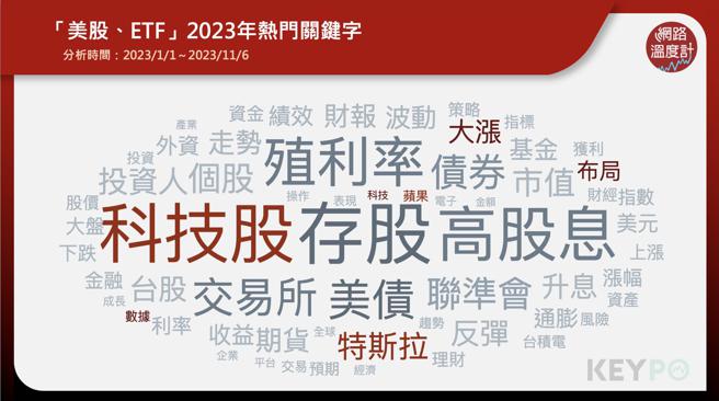 《KEYPO大数据关键引擎》舆情分析系统拥有巨量资料,以人工智慧作语意分析之工具资料搜集范围:每月处理1000亿以上中文资料的网路社群大数据资料库,其内容涵盖Facebook、YouTube、新闻媒体、讨论区、部落格等网站,针对讨论『美股、ETF』相关文本进行分析,调查「热门关键字」(注1)作为本分析依据。