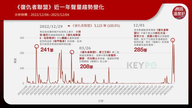透过《KEYPO大数据关键引擎》舆情分析系统可看见,《復仇者联盟》第5和第6季的拍摄内幕近一年间持续被爆出,声量共计5123笔。第一个声量高峰为2022年12月29日,一位推特知名爆料帐户发文表示小劳勃·道尼正和漫威商谈将在《復仇者联盟6:秘密战争》中以钢铁人的身分回锅,引爆了眾多影迷的高度期待。