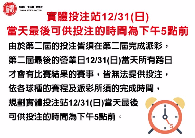 其次就是实体投注站,由于第二届的投注皆须在第二届完成派彩,第二届最后的营业日12/31(日)当天所有跨日才会有比赛结果的赛事,皆无法提供投注,依各球种的赛程及派彩所须的完成时间,规划实体投注站12/31(日)当天最后可供投注的时间为下午5点前。