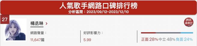《KEYPO大数据关键引擎》舆情分析系统拥有巨量资料,以人工智慧作语意分析之工具资料搜集范围:每月处理1000亿以上中文资料的网路社群大数据资料库,其内容涵盖Facebook、YouTube、新闻媒体、讨论区、部落格等网站,针对讨论『杨丞琳』相关文本进行分析,调查「网路声量」(注1)、「探索概念」(注2)作为本分析依据。