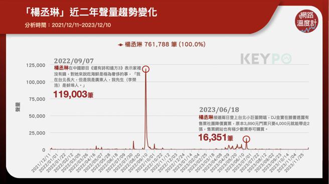 杨丞琳非首次失言!「海鲜说」、小巨蛋演唱会低价求售成声量高峰事实上,杨丞琳并非第一次因为失言登上新闻版面,从《KEYPO大数据关键引擎》舆情分析系统来看杨丞琳近二年声量趋势,2022年9月7日杨丞琳因为在中国浙江卫视节目《还有诗和远方3》表示家里没有钱,所以对她来说吃海鲜是极为奢侈的事,「我在台北长大,但是我是广东人,我先生(李荣浩)是蚌埠人。」网路声量累积119,003笔。