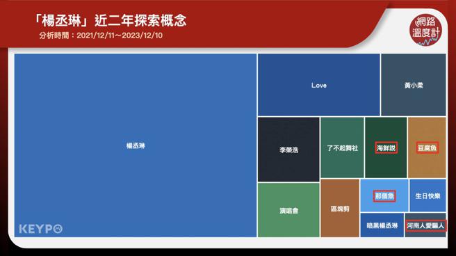 从《KEYPO大数据关键引擎》舆情分析系统来看杨丞琳近二年探索概念,杨丞琳在中国节目侃侃而谈自己小时候吃海鲜很奢侈,当天吃的鱼叫做「豆腐鱼」,儘管其他来宾表示台湾没有这种鱼,却被脸书粉专《屏东点 Pingtung.》打脸「豆腐鱼」其实就是屏东东港特产「那个鱼」,也就是「小鳍鎌齿鱼」,除了「海鲜说」、「豆腐鱼」、「那个鱼」等网路热词上榜,杨丞琳在近日演唱会提及「河南人爱骗人」也成为近期网友关注话题。