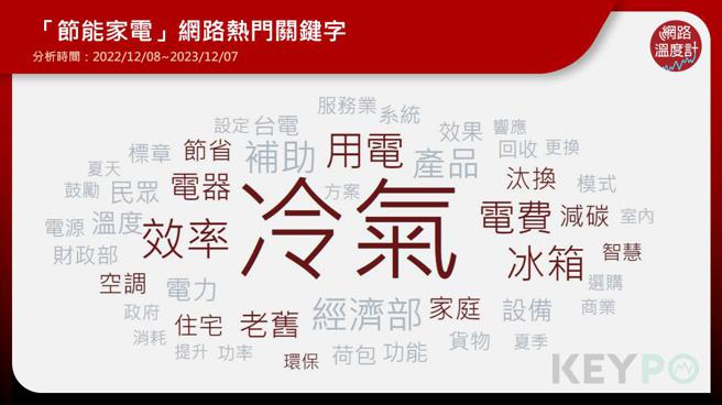 《DailyView网路温度计》透过《KEYPO大数据关键引擎》舆情分析系统观察,近一年内(2022/12/08~2023/12/07)「节能家电」的热门关键字,网友们高度关注讨论冷气、用电、电费、减碳、汰换等。
