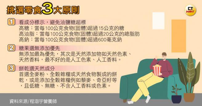 「首先最重要的就是控制份量或频率,其次是正确挑选零食。」程涵宇说,查看零食的成分表时,可先注意糖、脂肪、钠的含量,以每100公克来说,糖分建议在15公克以下、脂肪在20公克以下、钠在600毫克以下。