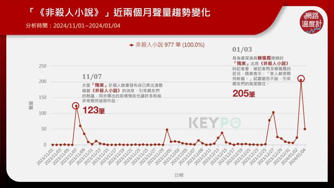 透过《KEYPO大数据关键引擎》舆情分析系统可以看见,《非杀人小说》在开播前就得到不少关注度,近两个月的声量为977笔,声量最高峰落在1月3日,共计205笔,当天身为主演的隋棠出席《非杀人小说》记者会,被记者问及婆婆赖佩霞的近况,隋棠仅回应「家人都很期待新戏」试图转移话题,引来网友们热议,反而制造出另一种话题度。