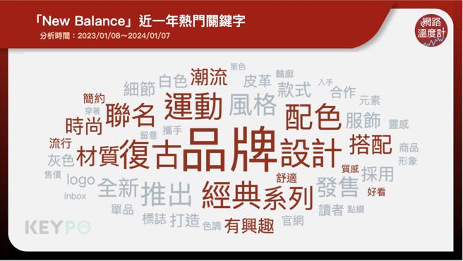 带起台湾復古穿搭风潮,从《KEYPO大数据关键引擎》舆情分析系统来看New Balance近一年热门关键字,包含品牌、復古、设计、质感、配色、经典、材质、舒适、运动、搭配、简约、时尚、潮流、流行、联名、好看等,显示该品牌在消费者心中的良好印象。