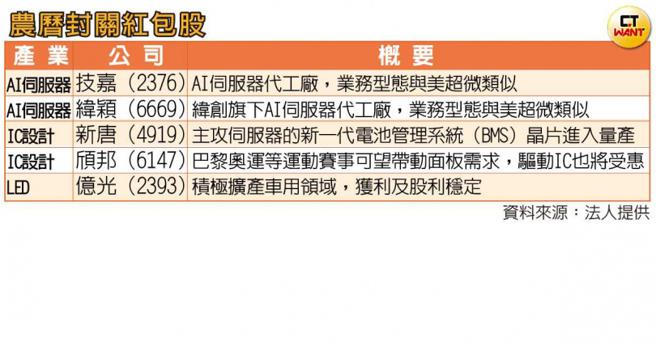 其中新唐的新一代电池管理系统(BMS)晶片进入量产,主攻伺服器,新唐近期股价位阶相对较低,可以留意。亿光则是积极扩产车用领域,包括车用照明,车用显示背光,亿光获利相当稳定,股价也进行修正过,股性相对温和,股利也很稳定,属于进可攻退可守的个股。颀邦主要生产驱动IC,而今年又有巴黎奥运,有机会推升面板需求,让驱动IC厂可望受惠。