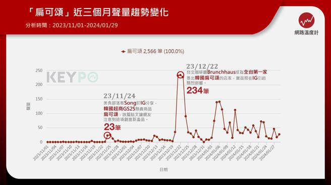 透过《KEYPO大数据关键引擎》舆情分析系统发现,「扁可颂」近三个月网路声量共2,566笔,去年11月24日美食部落客Song于IG分享,他在韩国超商买到的包装扁可颂,这款新滋味首度引起台湾人注意。单日声量最高峰出现在12月22日,台北咖啡厅Brunchhaus成为全台第一家贩售扁可颂的店家,产品在IG引起广大迴响,累积声量234笔,之后台湾各地出现不同店家贩卖,延续话题热度。