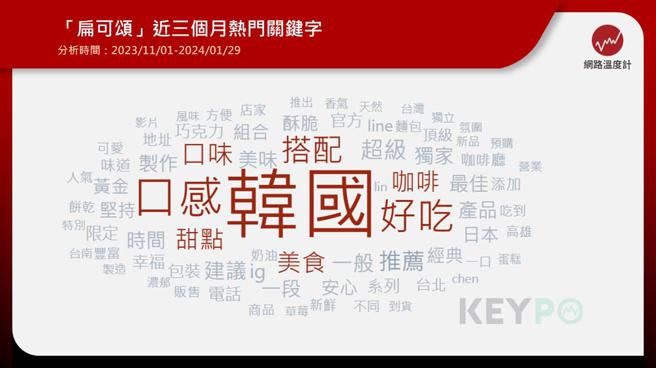从「扁可颂」近三个月热门关键字发现,来自「韩国」成为第一名词汇,前八名还包括「好吃、口感、美食、甜点、口味、搭配、咖啡」等,其中「搭配咖啡」一起出现,可发现网友认为这款新食品,配着咖啡享用最对味。台湾目前已有多家店铺贩售「扁可颂」,北、中、南以及连锁店都有卖,其中最便宜价位不到40元,提供给想要嚐鲜的大家,各种不同选择。