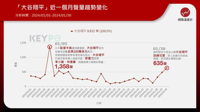 透过《KEYPO大数据关键引擎》舆情分析系统发现,「大谷翔平」近一个月网路声量共9,832笔,单日声量最高峰出现在1月5日,日本能登半岛1日受到强震重创,当日大谷翔平宣布和道奇球团合捐100万美元(约新台币3150万元)赈灾,另一件引发热议之事,则是美国媒体报导,族群学者汤格瑞吉(Stanley Thangaraj)指出,大谷翔平打破亚裔美国人刻板印象,影响力更胜李小龙、林书豪,两件事在当天创造1,358笔网路声量。