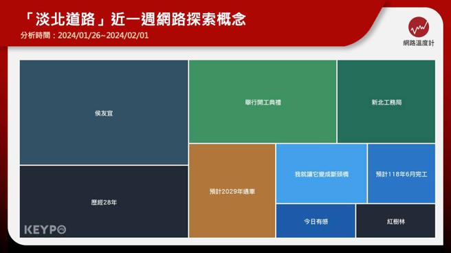 研究方法:《KEYPO大数据关键引擎》舆情分析系统拥有巨量资料,以人工智慧作语意分析之工具资料搜集范围:每月处理1000亿以上中文资料的网路社群大数据资料库,其内容涵盖Facebook、YouTube、新闻媒体、讨论区、部落格等网站,针对讨论『淡北道路』相关文本进行分析,调查「探索概念」(注1)作为本分析依据。
