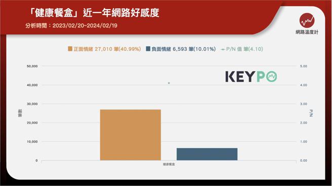 我们从《KEYPO大数据关键引擎》舆情分析系统来看「健康餐盒」近一年网路好感度,可以发现正面情绪声量高达27,010笔,负面情绪声量则为6,593笔,正面声量多出负面声量近4倍,好感度比值(P/N)值为4.10,可见近期网友对于健康餐盒大多抱持较高好感。