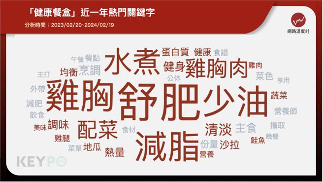 另从《KEYPO大数据关键引擎》舆情分析系统来看「健康餐盒」近一年热门关键字,包含舒肥、鸡胸、鸡胸肉、鸡肉、鸡腿、鲑鱼、沙拉、蔬菜、地瓜、配菜、水煮、少油、调味、热量、蛋白质、健身、减脂、均衡、营养、健康、清淡、美味等字。