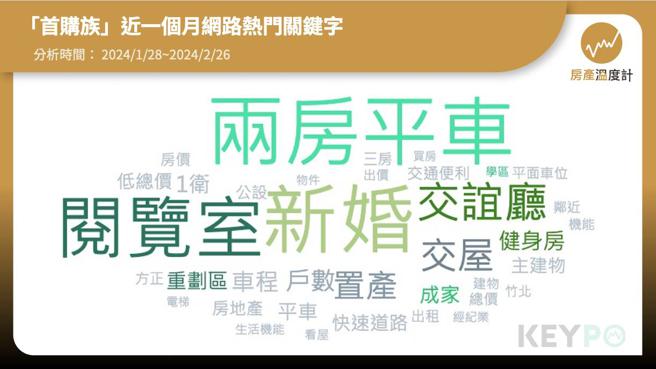 《房产温度计》根据《KEYPO大数据关键引擎》舆情分析系统(日期:2024/1/28~2024/2/26)显示,「首购族」近一个月热门关键字出现「两房平车、阅览室、交谊厅、重划区」。停车位是首购族买房考量重点之一,但停车位在人口密集的市区极为短缺,受到基地大小的限制,越来越多的机械车位出现。然而,这种趋势也导向了两房搭配平面车位的机会越来越稀有,引起不少房仲以「两房平车」为卖点宣传物件。