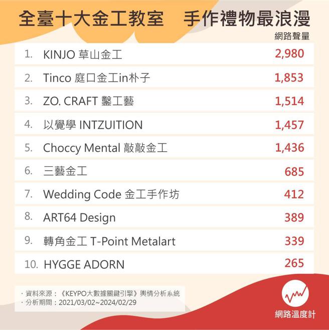 下周就是白色情人节了,如果还没想到要怎么和伴侣一同庆祝佳节的话,不妨到金工教室体验从零开打造出一份情侣对饰的乐趣吧!《DailyView网路温度计》透过《KYEPO大数据关键引擎》舆情分析系统,调查出网路声量最高的十大金工体验店家,还在苦恼如何规划白色情人节行程的你,这份清单一定要先收藏起来。