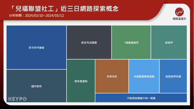 根据《KEYPO大数据关键引擎》舆情分析系统(日期:2024/03/10~2024/03/12)统计调查,近三日「儿福联盟社工」探索概念出现「配合司法调查、鞠躬道歉、孩子的守护神、不能相信蟑螂只有一两只」。儿福联盟董事长林志嘉12日于记者会鞠躬道歉,他强调,小孩委托给儿盟照顾,「发生事情就是我们的错」,社工本人也很内疚,对儿盟来说,这是没办法对社会交代的事情。儿福联盟脸书粉专「儿福联盟-孩子的守护者」也涌入大批网友挞伐,「好意思说是孩子的守护者喔」、「守护了什么」。