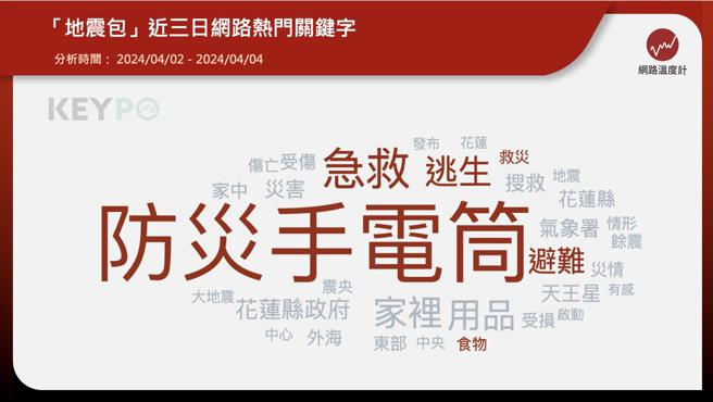 《KEYPO大数据关键引擎》舆情分析系统拥有巨量资料,以人工智慧作语意分析之工具资料搜集范围:每月处理1000亿以上中文资料的网路社群大数据资料库,其内容涵盖Facebook、YouTube、新闻媒体、讨论区、部落格等网站,针对讨论『地震包』相关文本进行分析,调查「热门关键字」(注)作为本分析依据。