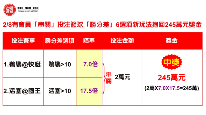 2/8(四)有位线上会员选了2场NBA进行「胜分差」6选项玩法的「串关」投注,他买2万元串2关,分别是「鹈鹕@快艇 胜分差鹈鹕>10 赔率7倍」串「活塞@国王 胜分差活塞>10 赔率17.5倍」,比赛的结果全数命中,赔率7倍及17.5倍相乘高达122.5倍,2万元的投注让他开心抱回245万元奖金,羡煞不少人。