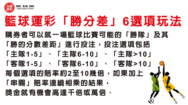 运彩篮球「胜分差」6个选项的玩法是指购券者可以就一场篮球比赛可能的「胜队」及其「胜的分数差距」进行投注,投注选项包括「主队1-5」、「主队6-10」、「主队>10」、「客队1-5」、「客队6-10」及「客队>10」等6项,毎个选项的赔率约2至10几倍,如果加上「串关」赔率连续相乘的结果,奖金就有机会高达千倍或万倍。
