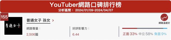 2024年4月8日,一名网友在PTT八卦版上好奇询问「普通女子孙女的订阅怎么那么少」,引起乡民热烈讨论,网路声量也累积432笔。