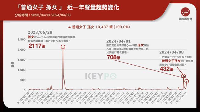 从《KEYPO大数据关键引擎》舆情分析系统来看「普通女子 孙女」近一年声量趋势,可以发现三大声量高峰,2023年6月28日,孙女在YouTube发布到内门总铺师婚宴办桌当水脚体验,影片截至目前为止突破70万次观看,不少人也分享,「真的好喜欢这种充满人情味的主题,这是花多少钱都砸不出来的企划,孙女对所有事情都充满好奇,都用心去体会,跟各种个性的人都能好好相处,真的很感谢你这么认真耕耘和留下这些珍贵的影片」、「医生怕治咳嗽,总铺师怕吃中午。可见得当总铺师办桌,真的是很辛苦的行业,南部的办桌虽然没有华丽的会场,但是我觉得菜色是绝对不会输大餐厅,而且还有满满的人情味」,当日网路声量累积2117笔。
