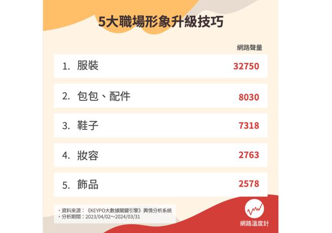 职场环境中,除了比拚专业硬实力,外在形象管理和内在软实力也至关重要!恰当的服装能够打造个人气场,也能在第一时间内给同事和客户留下良好印象;流畅的谈吐和出色的沟通能力,则是工作过程中不可或缺的加分项。《网路温度计DailyView》透过《KEYPO大数据关键引擎》舆情分析系统,调查最受网友讨论的「5大职场形象加分技巧、5大职场软实力加分特质」,快来看看哪些能够帮助你在竞争激烈的职场环境中脱颖而出!